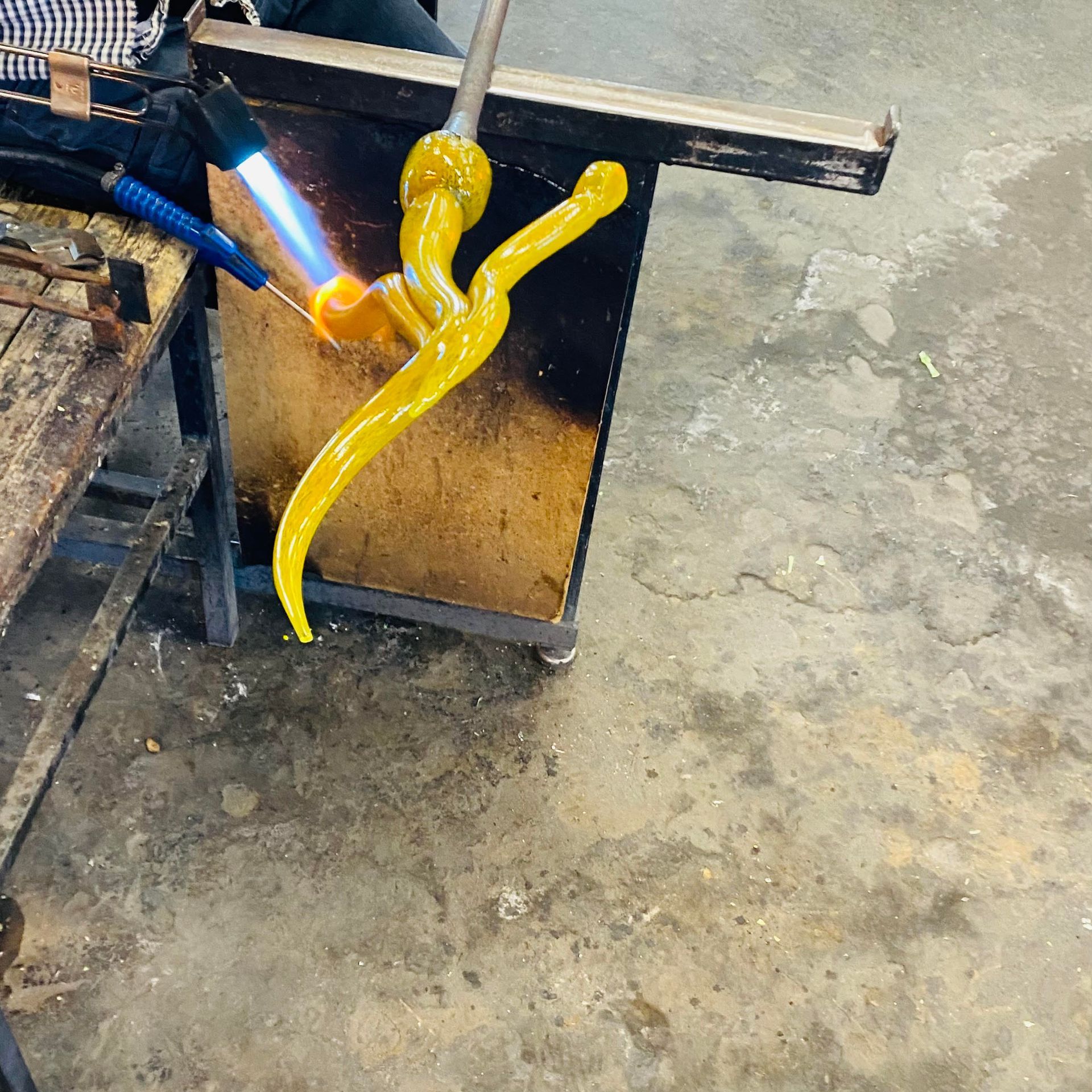Trying to make some small stuff. Blown and ‘overblown’ tadpoles since my youngest daughter is so fond of them…working in the hotshop from The Glass Factory.