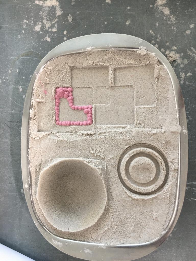 Sandcasting; play in a sandbox and create a mold to be filled with glass-frit. This technique is accessible to the very young while it can also be quite challenging, it all depends on your execution.